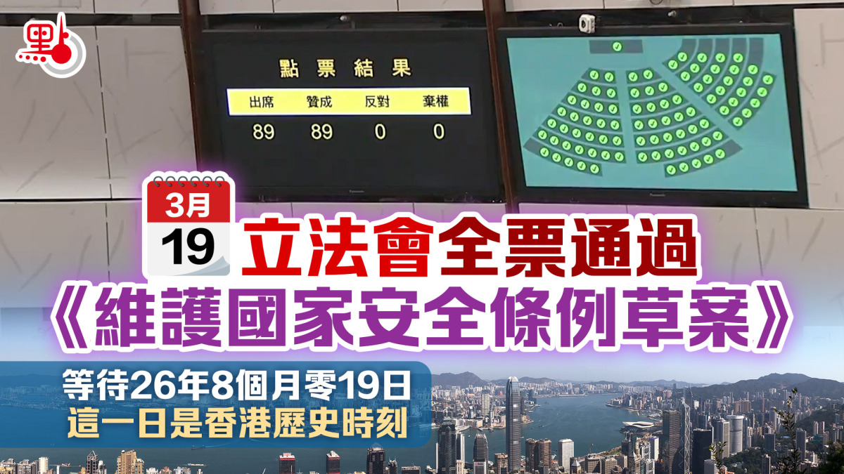 【點新聞報道】3月19日,立法會全票通過《維護國家安全條例草案》,順利完成基本法第23條立法,進一步落實特區維護國家安全的憲制責任。這一天是香港的歷史時刻,是香港等待了26年8個月零19日的歷史時刻,是第六屆特區政府和第七屆立法會共同完成光榮使命的歷史時刻,是香港特區共同譜寫光榮歷史的驕傲時刻。香港多個法律團體紛紛發表聲明,全力支持完成基本法第23條立法,指《維護國家安全條例》在維護國家安全和保障基本人權之間取得適當平衡,深信法律界將繼續謹守崗位服務香港。