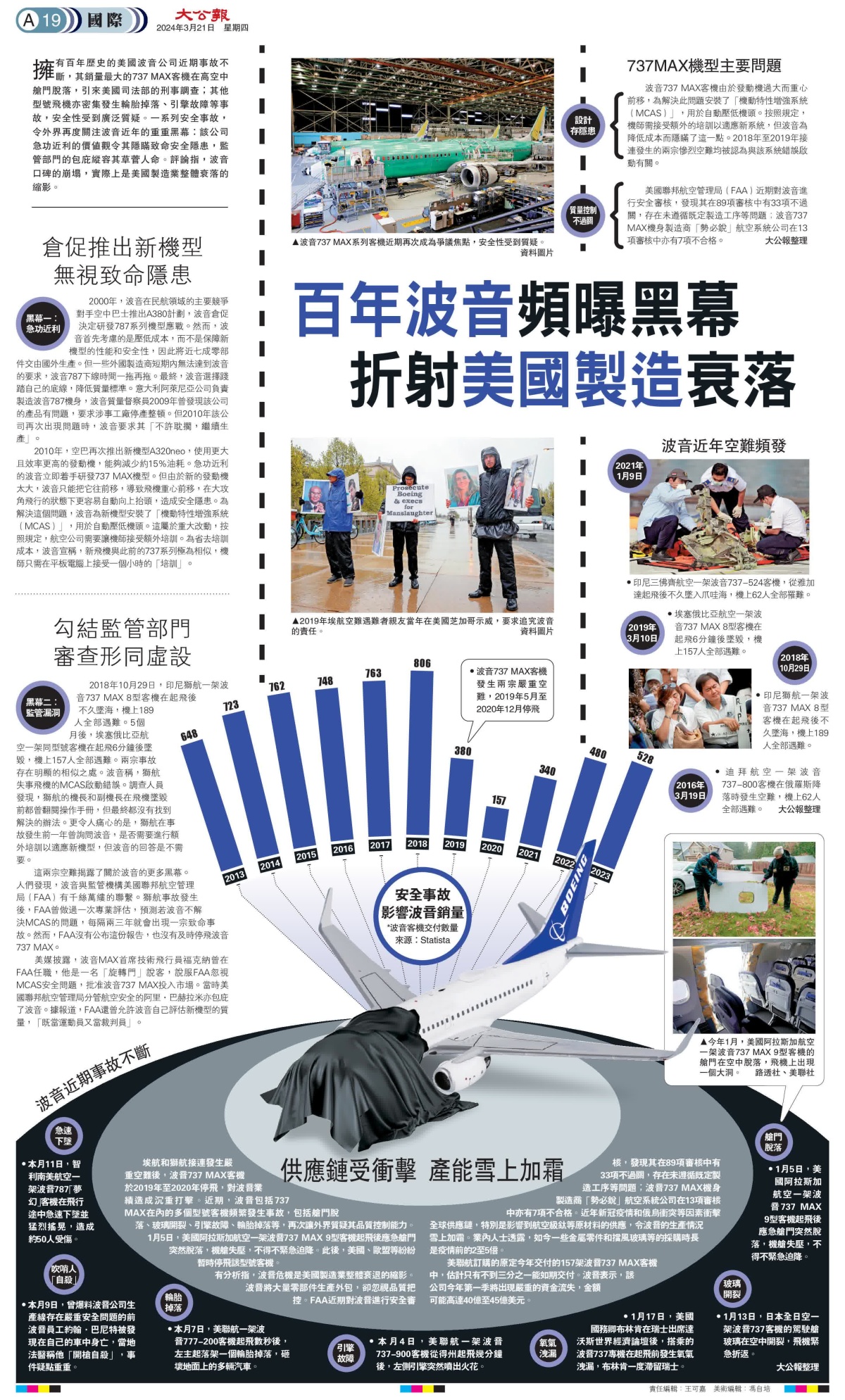 擁有百年歷史的美國波音公司近期事故不斷,其銷量最大的737 MAX客機在高空中艙門脫落,引來美國司法部的刑事調查;其他型號飛機亦密集發生輪胎掉落、引擎故障等事故,安全性受到廣泛質疑。一系列安全事故,令外界再度關注波音近年的重重黑幕:該公司急功近利的價值觀令其隱瞞致命安全隱患,監管部門的包庇縱容其草菅人命。評論指,波音口碑的崩塌,實際上是美國製造業整體衰落的縮影。