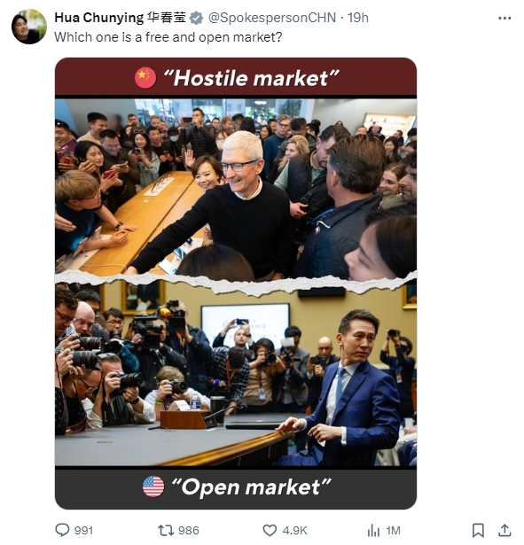 【點新聞報道】外交部部長助理、發言人華春瑩昨日(21日)在社交媒體X上發布了一張圖片,對比蘋果首席執行官庫克訪華時與TikTok首席執行官周受資出席美國國會聽證會時的畫面,並配文問道:「哪個是自由開放市場?」