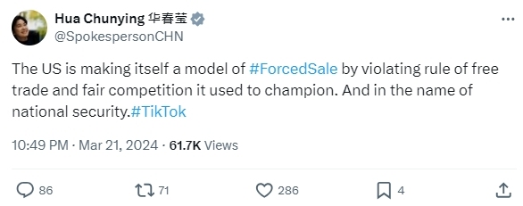 不久後,華春瑩發文指出,「美國違反了它曾經標榜的自由貿易和公平競爭規則,使自己成為『強制出售』的典型。以所謂國家安全的名義。」