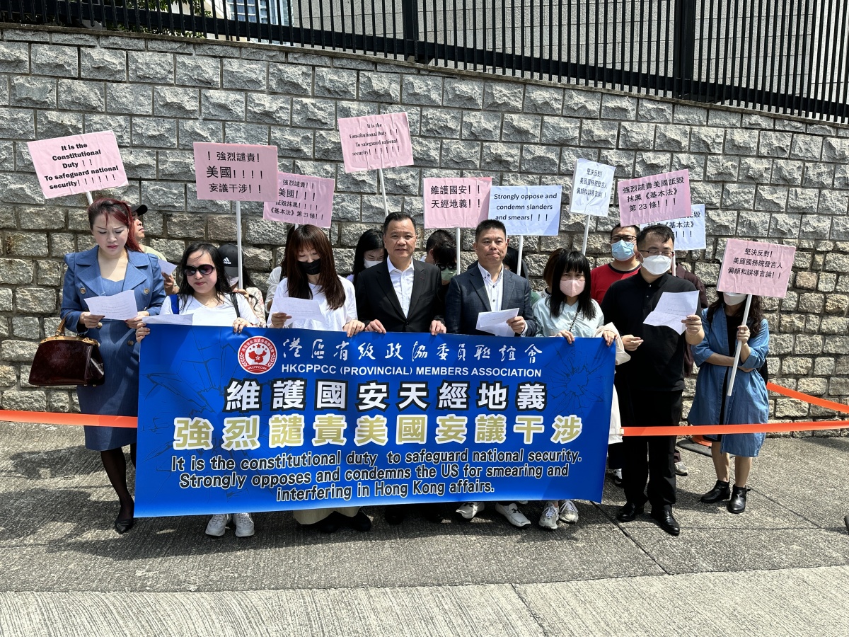 港區省級政協委員聯誼會今日(24日)上午前往美國駐港澳總領事館抗議,該會表示,維護國安天經地義,強烈譴責美國妄議干涉基本法23條立法,堅決反對美國國務院發言人的偏頗和誤導言論。
