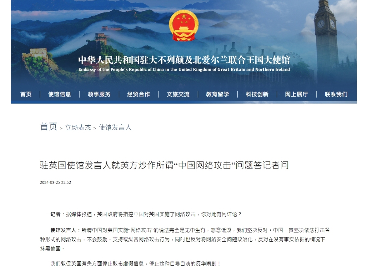 使館發言人:所謂中國對英國實施「網絡攻擊」的說法完全是無中生有,惡意詆毀,我們堅決反對。中國一貫堅決依法打擊各種形式的網絡攻擊,不會鼓勵、支持或縱容網絡攻擊行為,同時也反對將網絡安全問題政治化,反對在沒有事實依據的情況下抹黑他國。