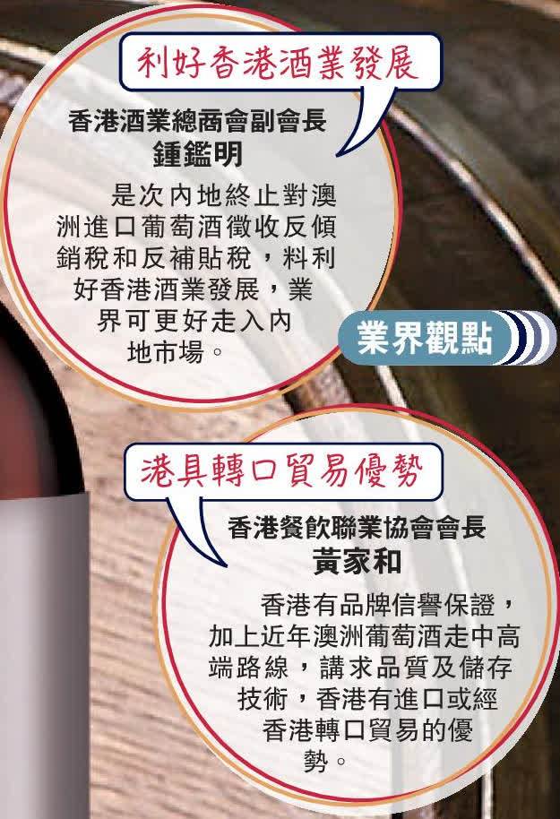 香港「一國兩制」制度優勢和雙向開放區位優勢再添例證。中國商務部28日發布公告,29日起取消對澳洲葡萄酒反傾銷、反補貼關稅。據介紹,澳洲酒商一直等待內地解除關稅,預早在港囤貨鋪路重返內地,這突顯香港作為全球貿易中心、亞洲葡萄酒國際貿易重要樞紐的優勢。