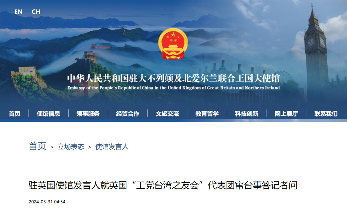 【點新聞報道】據報道,英國「工黨台灣之友會」代表團近日在台灣竄訪。中國駐英國使館發言人回應指,英國工黨有關議員不顧中方堅決反對,執意竄訪中國台灣地區,這是對一個中國原則的公然違反,粗暴干涉中國內政,向「台獨」分裂勢力發出了錯誤信號。中方予以強烈譴責。
