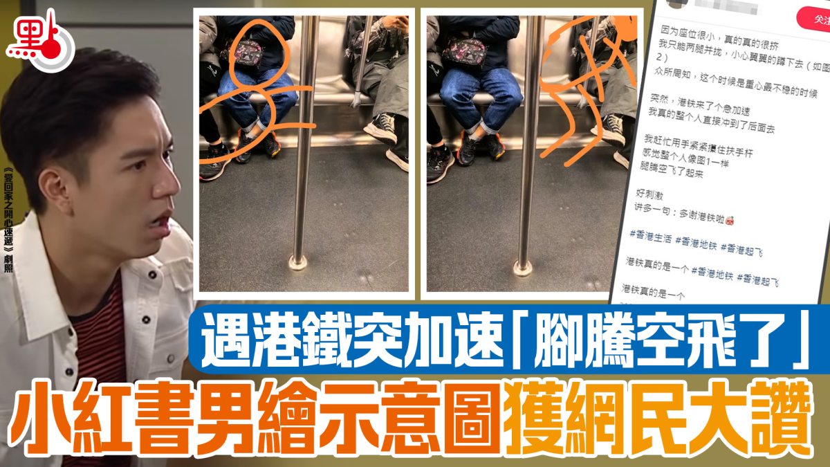 該名男子在小紅書以「HK謝謝港鐵,今天飛了」為題發文,指早前乘搭港鐵,進入車廂後找到一個空位,但由兩旁都坐了乘客,中間的座位很擠、很小,所以他只能兩腿併攏小心翼翼地坐下,惟此時港鐵突然一個加速,令他重心不穩整個人直接衝了出去,「趕緊用手緊緊握住扶手杆,感覺整個人腿騰空飛了起來」。