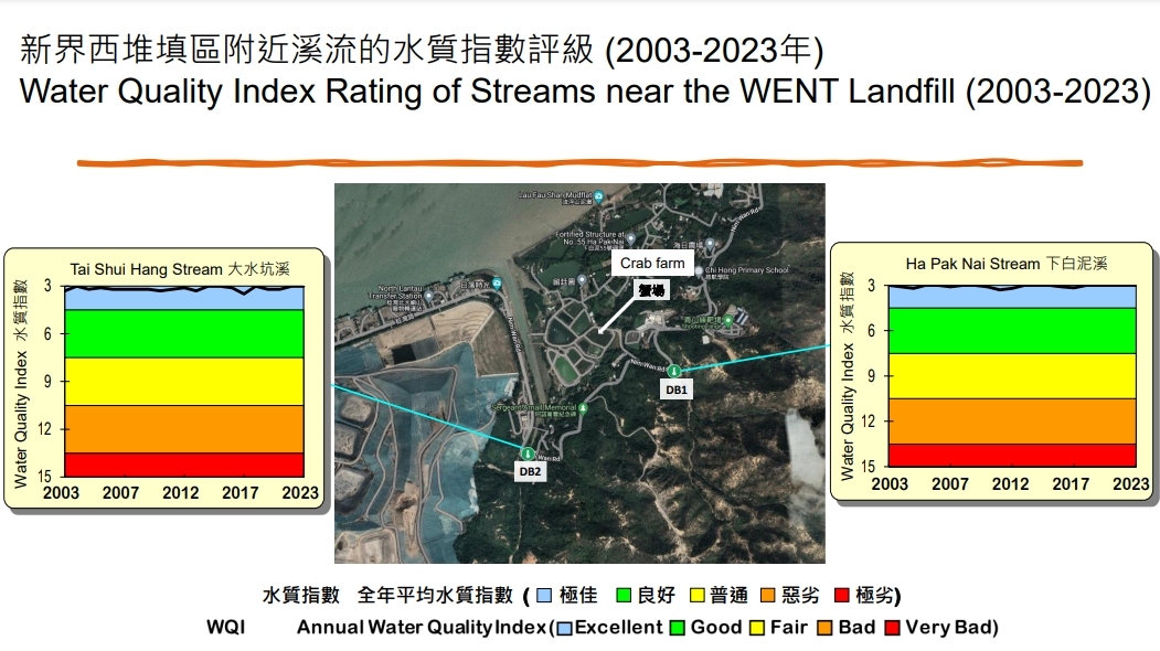 環保署表示,新界西堆填區是以全密封式設計及建造,設有多層合成防滲透墊層和管道遍布整個堆填範圍,所有污水被全面收集和處理後排入公共污水渠,並不會進入附近河溪。環保署定期在大水坑溪進行水質監測,結果亦顯示水質一直維持在極佳水平,水中生態系統保持正常,沒有被污染的跡象。
