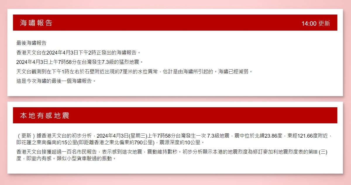 本港天文台下午2時發出的海嘯報告指,觀測到在下午1時左右於石壁附近出現約7厘米的水位異常,估計是由海嘯所引起。海嘯已經減弱,這是今次海嘯的最後一個海嘯報告。