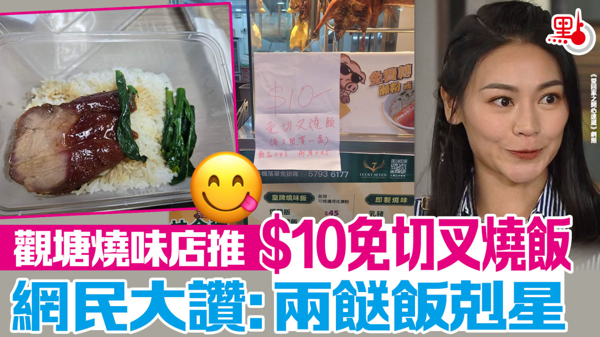 位於觀塘駿業街的燒味店「港燒味」,近日推出「驚喜價$10免切叉燒飯」,稱為感謝食客一直以來的支持,推出超值限時優惠,另加3元有飲品、加5元有例湯,每人限買一盒。從網上圖片可見,「免切叉燒飯」份量雖不算多,但有飯、有菜又有叉燒,性價比可謂極高。