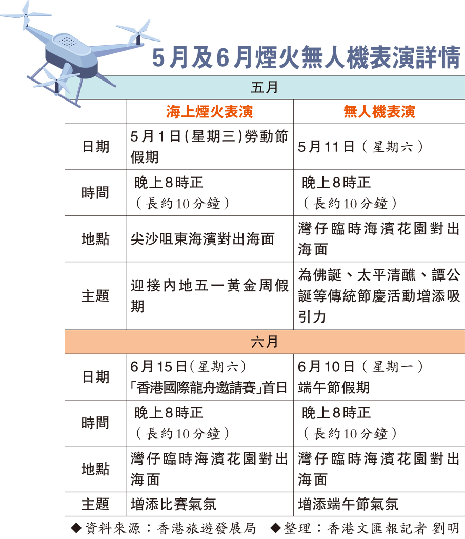 每年的五一黃金周是香港旅遊業重要檔期,為吸引更多旅客訪港,萬眾期待的每月維港海上煙火及無人機表演今年將在這個旅遊旺季上演。香港旅遊發展局總幹事程鼎一昨日宣布,5月1日及11日以及6月10日和15日將配合節慶及大型活動,分別於尖沙咀東部和灣仔海濱,推出兩場煙火及兩場無人機表演(見表),各有不同主題,以配合不同節日。旅發局表示,提早公布活動時間表,讓旅遊、餐飲、零售等業界籌備相關旅遊產品及優惠,將旅遊效益最大化,「吸客」之餘更希望推動香港氛圍,為市民帶來歡樂。