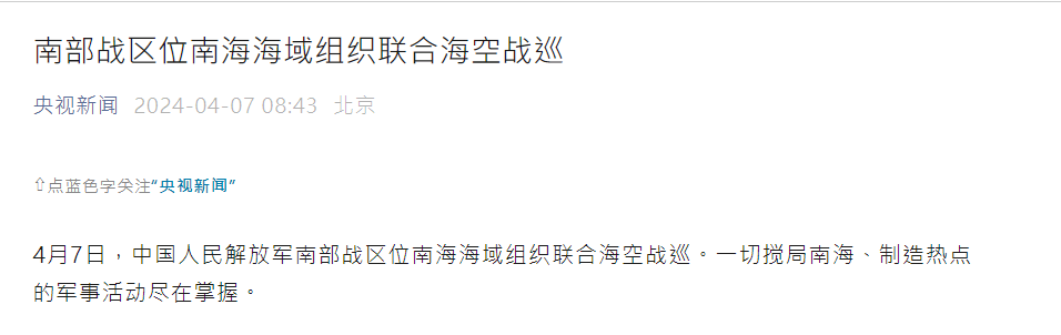 【點新聞報道】4月7日,中國人民解放軍南部戰區在南海海域組織聯合海空戰巡。一切攪局南海、製造熱點的軍事活動盡在掌握。