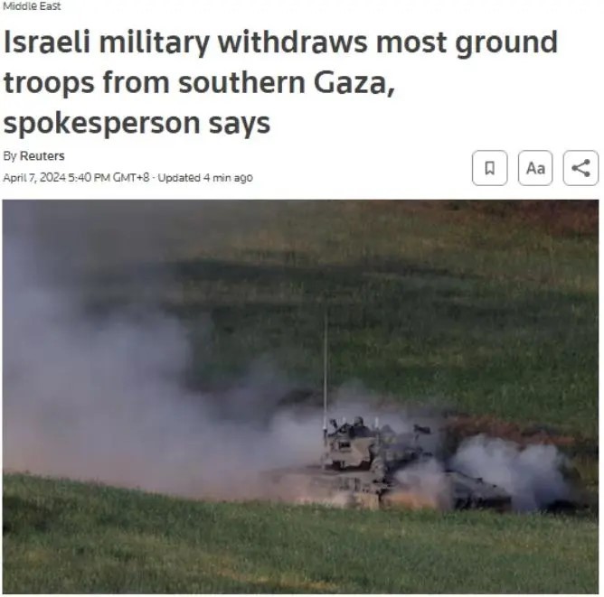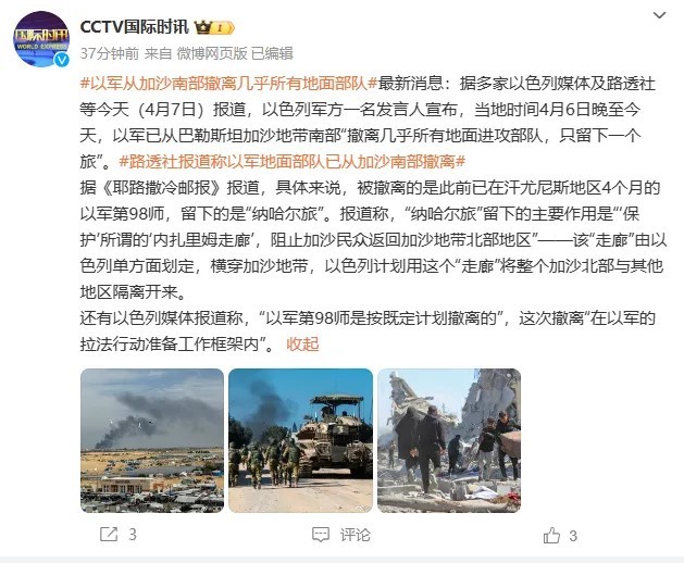 【點新聞報道】中新網援引路透社消息,當地時間4月7日,以色列軍方發言人表示,以軍已從加沙地帶南部撤出幾乎所有地面部隊,僅留下一個旅的人員。