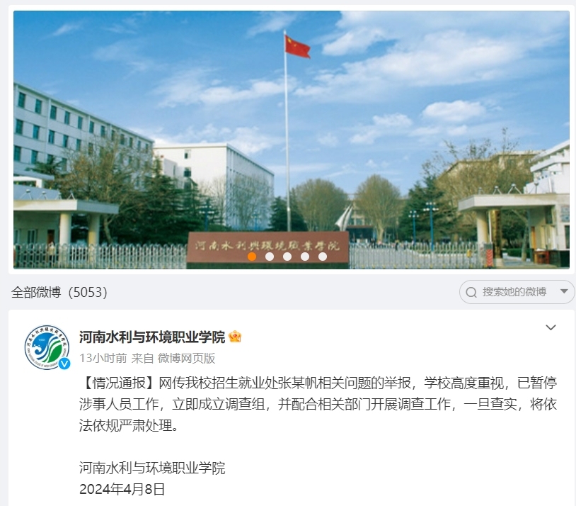 4月8日,河南水利與環境職業學院官方微博發布情況通報。通報指,網傳我校招生就業處張某帆相關問題的舉報,學校高度重視,已暫停涉事人員工作,立即成立調查組,並配合相關部門開展調查工作,一旦查實,將依法依規嚴肅處理。