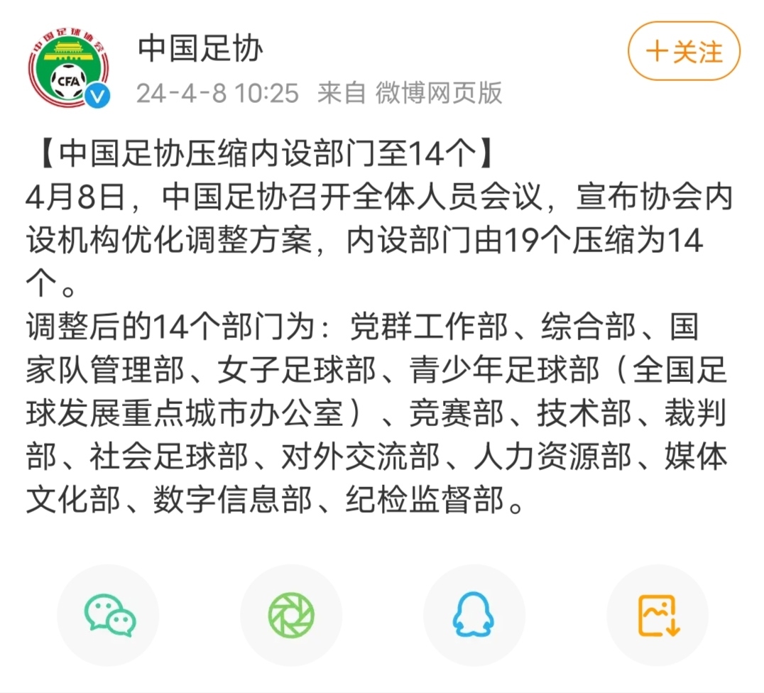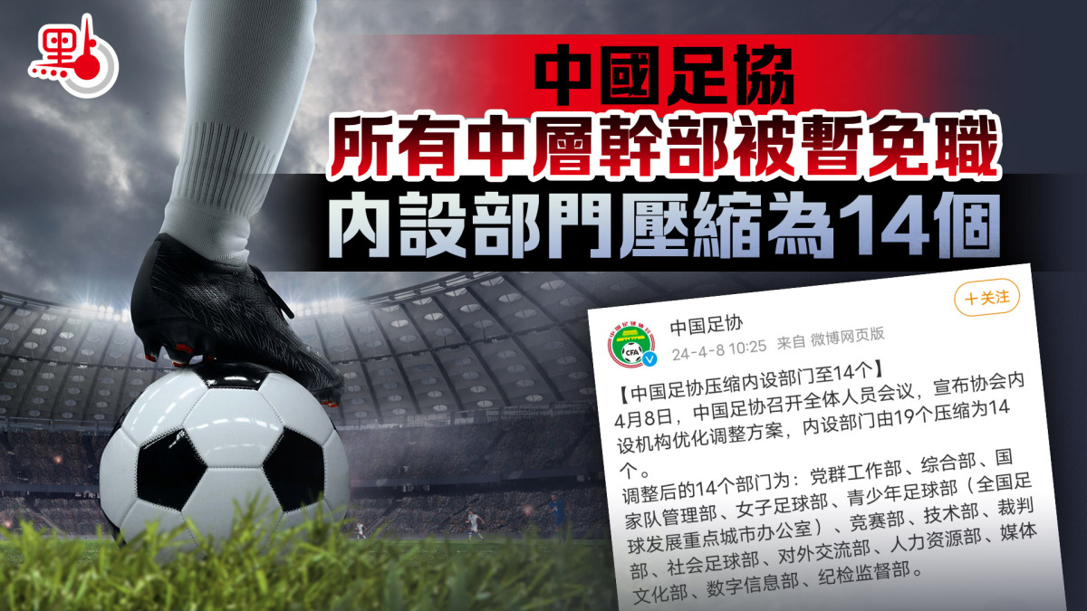 【點新聞報道】據中國足協官網消息,4月8日中國足協召開全體大會,宣布協會內設部門由19個壓縮為14個。另據足球報官方微博消息稱,包括協會副秘書長在內的所有中層幹部被免去職務,等待組織機構調整之後的人事安排。