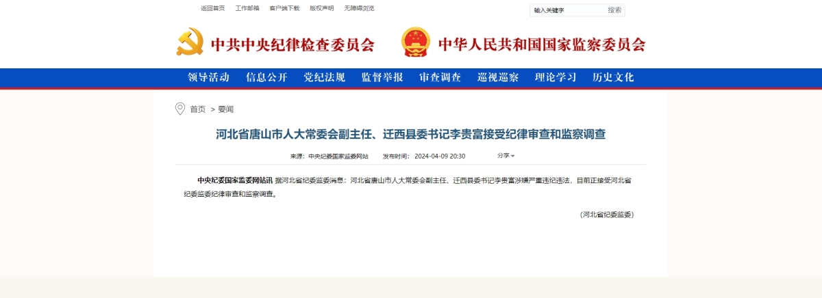 【點新聞報道】據中央紀委國家監委網站4月9日發布,河北省紀委監委消息:河北省唐山市人大常委會副主任、遷西縣委書記李貴富涉嫌嚴重違紀違法,目前正接受河北省紀委監委紀律審查和監察調查。