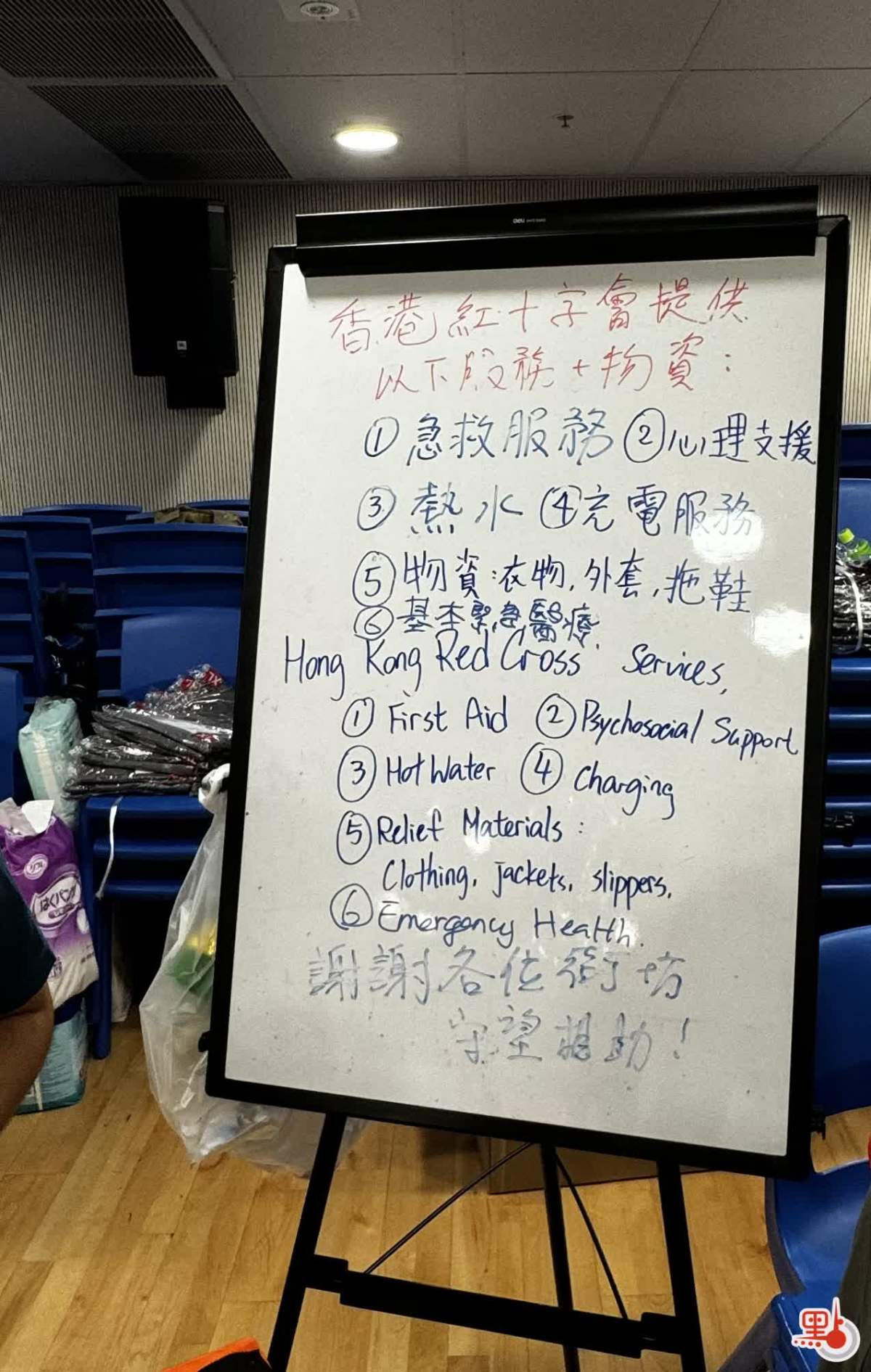 一樓的大會堂場地寬闊,被安置了數十張地墊。入住過程是先來到三樓的辦公場所登記,隨後在房間等待。其間發放了衣物、床上用品和水。她表示衣物方面的物資非常充裕。因事發緊急,當時自己只穿了睡衣逃出。派發的衣物包括保暖的灰色衝鋒衣、長褲,以及班尼路牌子的短袖。一位來自印尼的居民表示,物資中唯獨缺少「襪子」,希望政府可以補發。