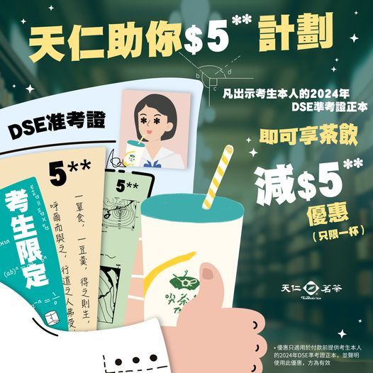 【點新聞報道】天仁茗茶今日(11日)宣布,即日起至5月10日推出DSE考生優惠,凡於天仁茗茶香港門市出示2024年准考證正本,可即享茶飲減免5蚊優惠。