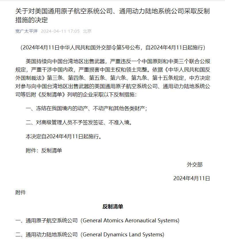 美國持續向中國台灣地區出售武器,嚴重違反一個中國原則和中美三個聯合公報規定,嚴重干涉中國內政,嚴重損害中國主權和領土完整。依據《中華人民共和國反外國制裁法》第三條、第四條、第五條、第六條、第九條、第十五條規定,中方決定對參與向中國台灣地區出售武器的美國通用原子航空系統公司、通用動力陸地系統公司等後附《反制清單》列明的企業採取以下反制措施: