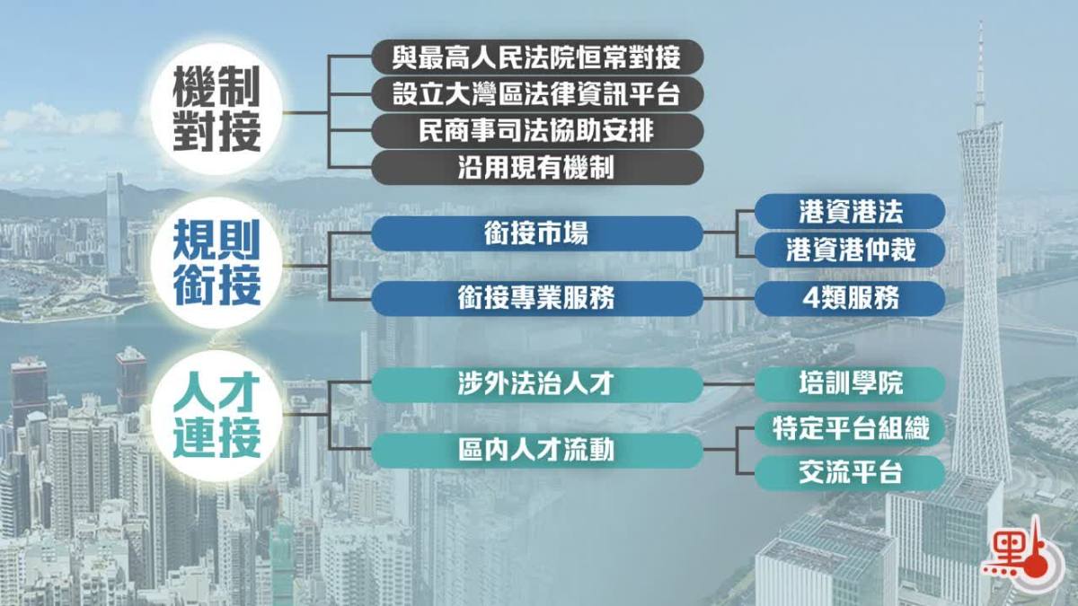 其中,「機制對接」有四項,分別是律政司與最高人民法院建立高層次恒常對接平台,研究司法及法律理論、整合民商事司法協助機制等,又會建立公開的粵港澳大灣區法律資訊平台,讓公眾可以查閱到法院資訊、律師執業資料等。另外,跟進民商事司法協助安排的落實情況,以及用好現行專責小組及聯席會議。