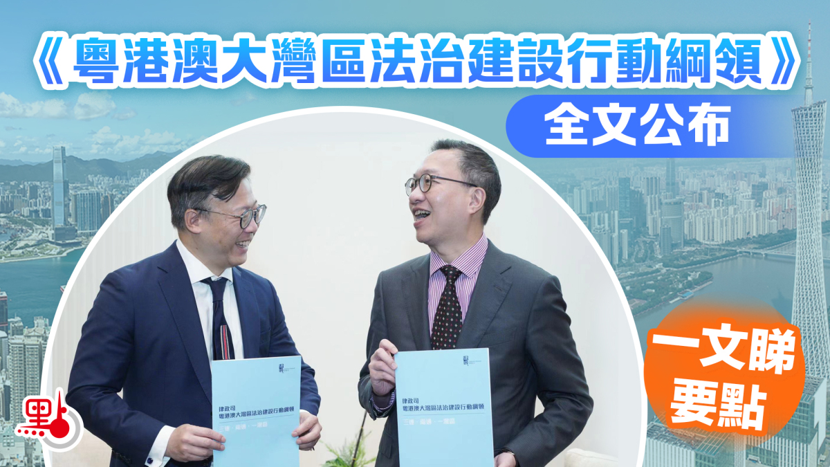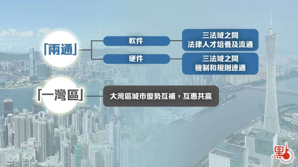 律政司打趣說,如果上聯是「一國、兩制、三法域」,下聯就是「三連、兩通、一灣區」。《粵港澳大灣區法治建設行動綱領》都有哪些要點?快來一文睇清!