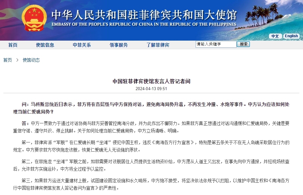 【點新聞報道】菲律賓總統馬科斯近日表示,菲方將在各層級與中方保持對話,避免南海局勢升溫,不再發生衝撞、水炮等事件。據中國駐菲律賓大使館今日(13日)消息,中國駐菲律賓使館發言人回應當前仁愛礁局勢時表示,中方一貫致力於通過對話協商與菲方妥善管控南海分歧,並為此作出不懈努力。如果菲方真正想通過對話溝通緩和仁愛礁局勢,關鍵是要重信守諾、遵守共識、停止挑釁。關於如何處理當前仁愛礁局勢,中方立場清晰、明確。