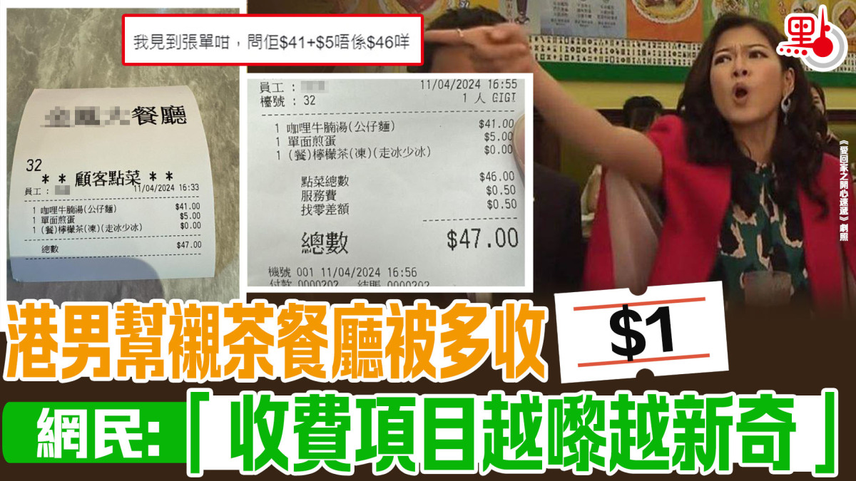 茶餐廳一般不會收取服務費,不過近日有網民在討論區發文,表示早前光顧了一間茶餐廳,看到帳單時卻發現被多收1元,事主直言沒有怪責餐廳的意思,只是好奇而已。帖文引起不少網民熱議「收費項目越嚟越新奇」。