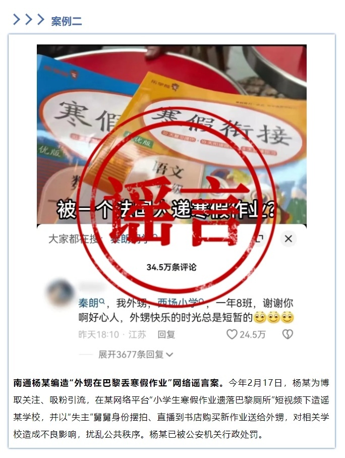 【點新聞報道】4月12日,公安部公布10起打擊整治網絡謠言違法犯罪典型案例。其中提到,浙江、江蘇公安機關查處「寒假作業丟巴黎」擺拍引流案。公安機關查明徐某藝與其公司編導薛某編造劇本,在網上購買寒假作業本,擺拍視頻進行發布。網紅博主「Thurman貓一杯」發視頻稱:承認秦朗巴黎丟寒假作業事件為編造,給大家道歉,深感愧疚和抱歉。