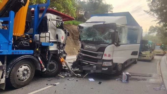 【點新聞報道】打鼓嶺發生交通意外。事發今早(15日)7時許,一輛吊臂車沿打鼓嶺蓮麻坑路行駛,駛近瓦窰村對開,與對面線一輛中型貨車迎頭相撞,尾隨貨車的綠頂小巴疑收掣不及撞向貨車車尾。吊臂車司機及貨車司機一度被困車內,其後由救援人員救離駕駛室,其中一人頭部受傷流血。