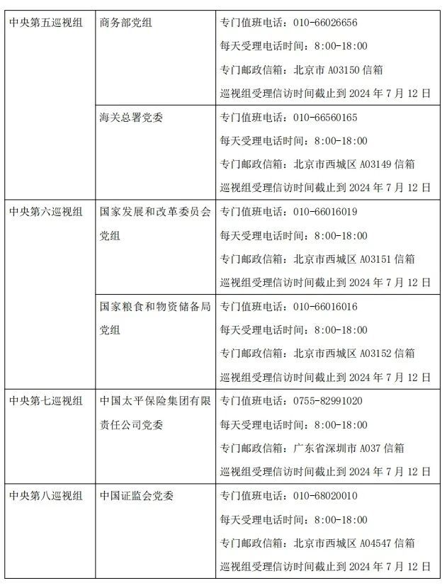 根據巡視工作條例規定,中央巡視組主要受理反映被巡視黨組織領導班子及其成員、下一級黨組織主要負責人和重點崗位人員問題的來信來電來訪,重點是關於違反政治紀律、組織紀律、廉潔紀律、群眾紀律、工作紀律和生活紀律等方面的舉報和反映。其他不屬於巡視受理範圍的信訪問題,將按規定由有關部門認真處理。
