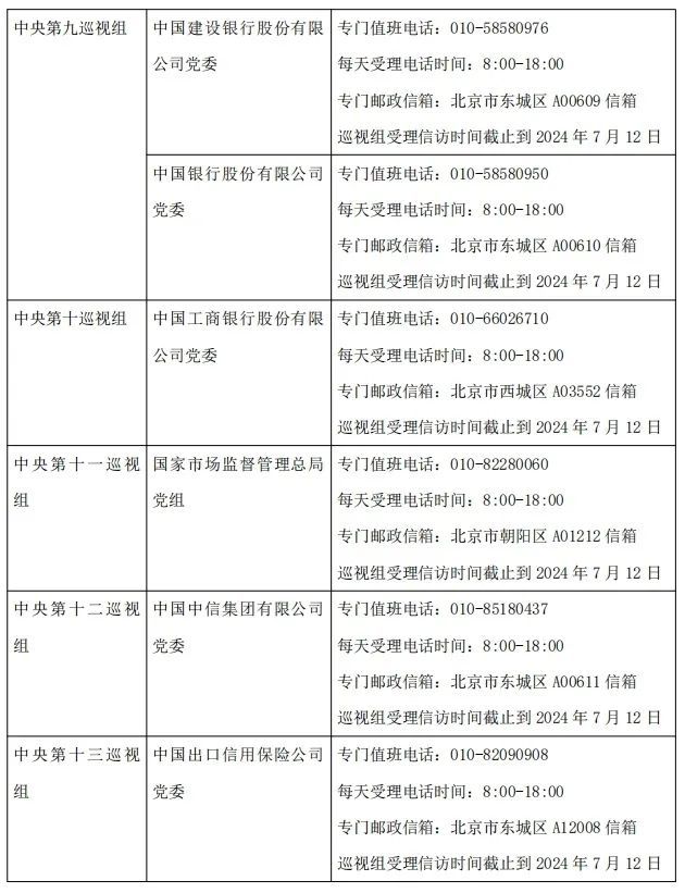 經黨中央批准,二十屆中央第三輪巡視將對國家發展和改革委員會、財政部、自然資源部、住房和城鄉建設部、農業農村部、商務部、中國人民銀行、審計署、海關總署、國家稅務總局、國家市場監督管理總局、國家金融監督管理總局、中國證券監督管理委員會、國家統計局、國家知識產權局、國家糧食和物資儲備局、國家能源局、國家林業和草原局、國家外匯管理局、中華全國供銷合作總社、全國社會保障基金理事會、中國地質調查局、上海證券交易所、深圳證券交易所、中國進出口銀行、中國工商銀行股份有限公司、中國農業銀行股份有限公司、中國銀行股份有限公司、中國建設銀行股份有限公司、交通銀行股份有限公司、中國中信集團有限公司、中國人壽保險(集團)公司、中國太平保險集團有限責任公司、中國出口信用保險公司等34家單位黨委(黨組)開展常規巡視。