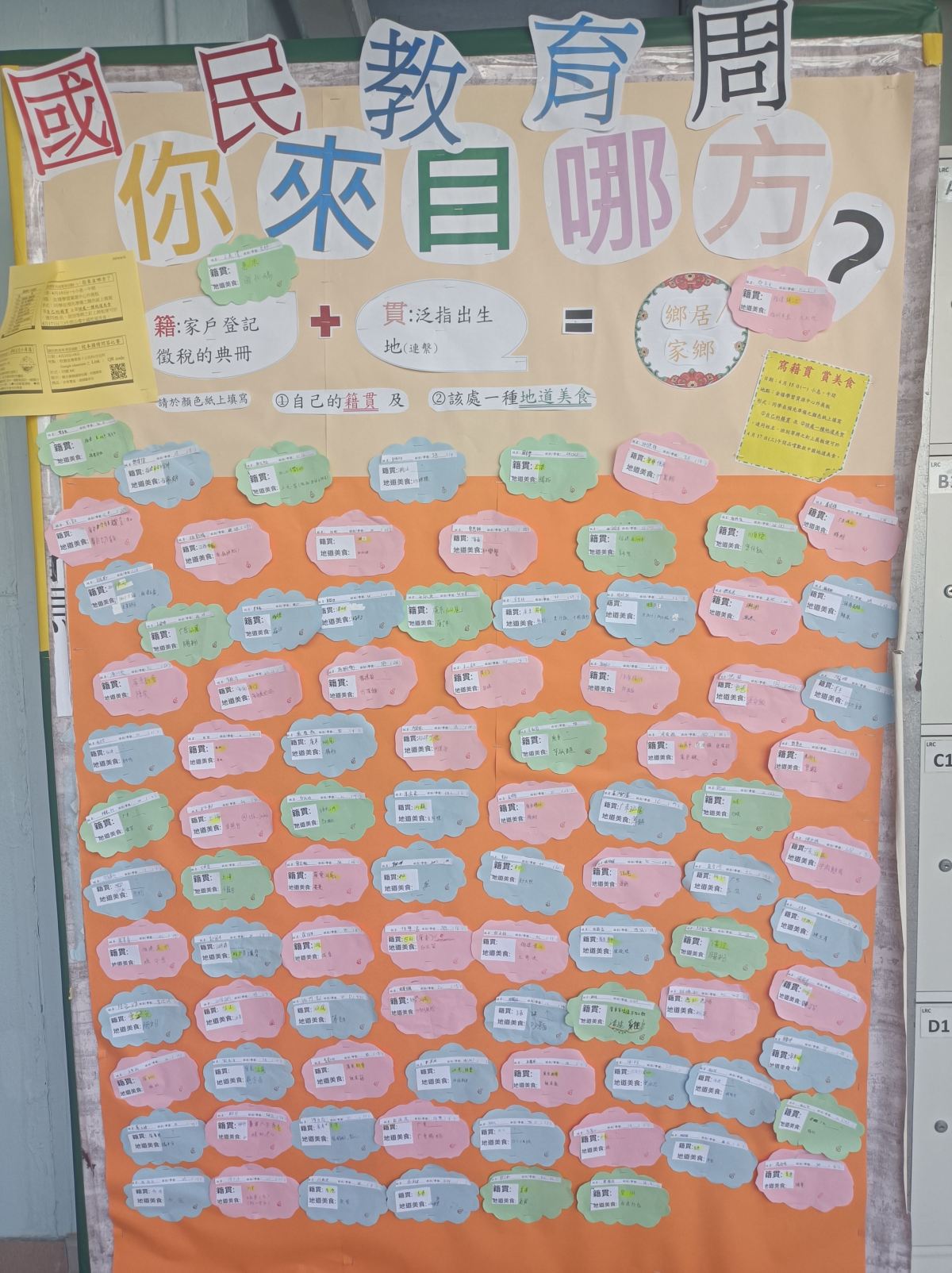本校於4月15日開展「你來自哪方?」活動,介紹「籍貫」概念及其釋義。師生於色紙上填寫自身籍貫和地道美食,並張貼有關壁布板。所有參與同學可享用「中國地道美食」,包括福州魚丸、潮汕豆包、糖蔥薄餅及冰糖紅果脆,逾百位師生響應活動,場面熱鬧,同學既能認識自己的家鄉,尋本問根。