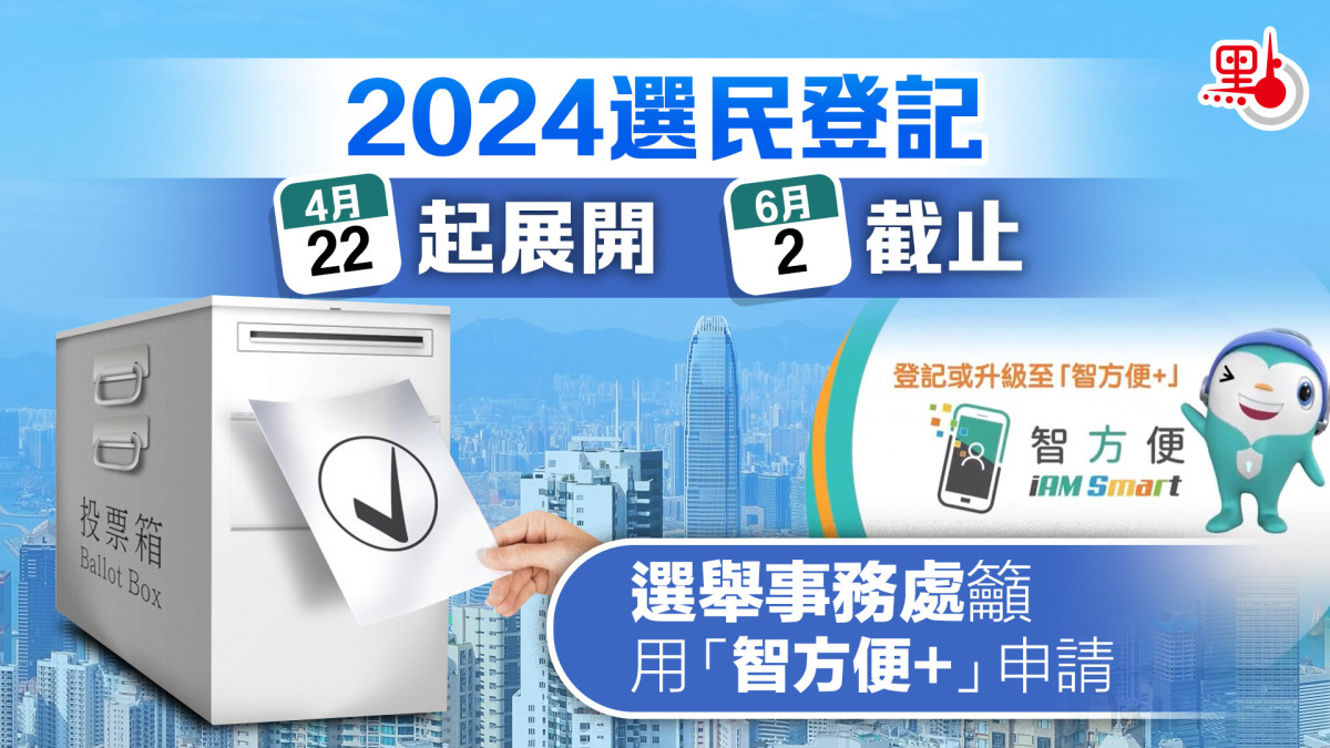 【點新聞報道】2024年選民登記運動今日(22日)展開。選舉事務處呼籲合資格的個人或團體,如尚未登記為地方選區、功能界別及/或選舉委員會界別分組選民/投票人,須於法定限期6月2日或之前提交登記申請,其登記資料方可被納入今年9月發表的正式選民/投票人登記冊。
