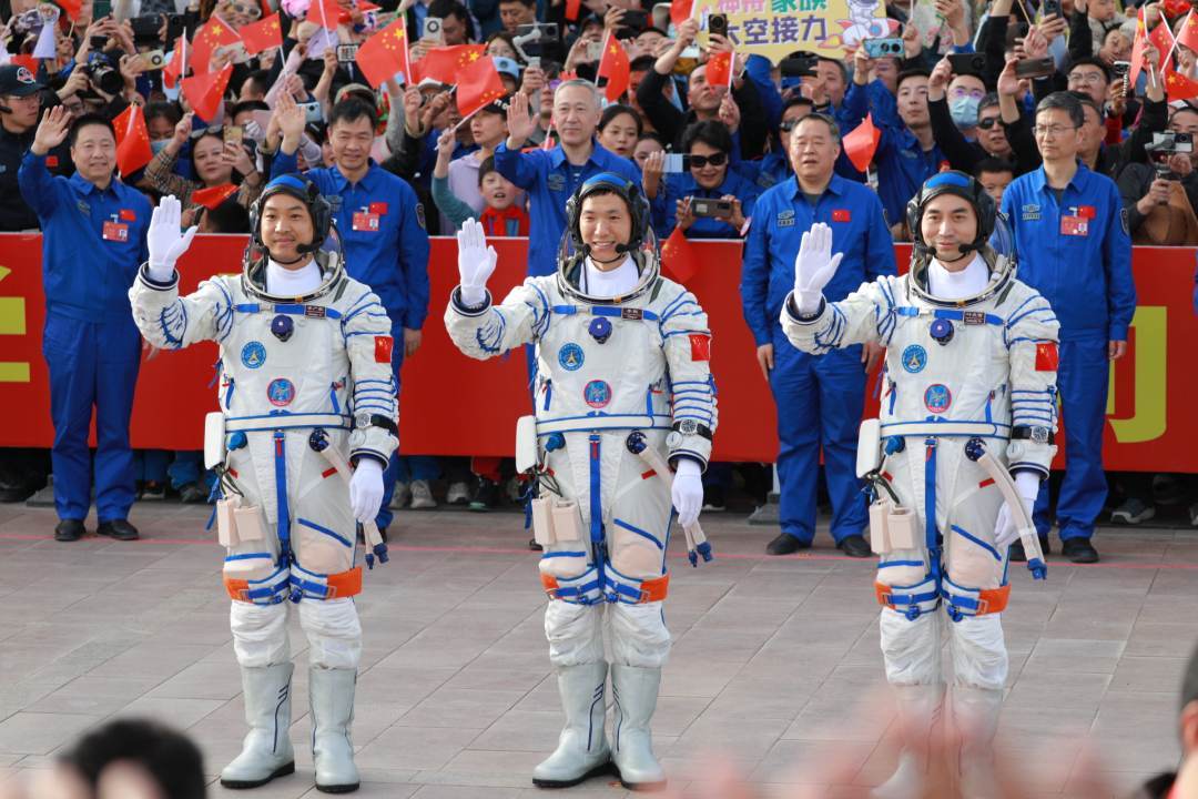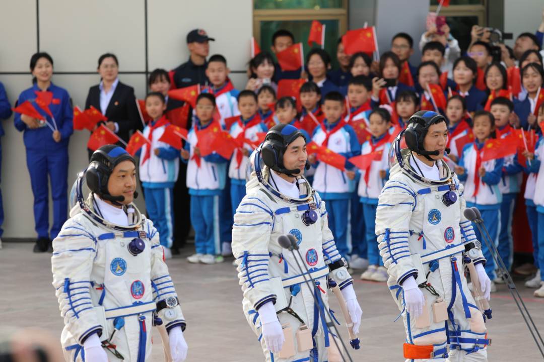 【點新聞報道】據中國載人航天工程辦公室消息,北京時間今日(4月25日)18時09分,神舟十八號載人飛行任務航天員乘組出征儀式在酒泉衛星發射中心問天閣圓夢園廣場舉行。18時10分,中國載人航天工程總指揮、空間站應用與發展階段飛行任務總指揮部總指揮長許學強下達「出發」命令,葉光富、李聰、李廣蘇3名航天員領命出征。