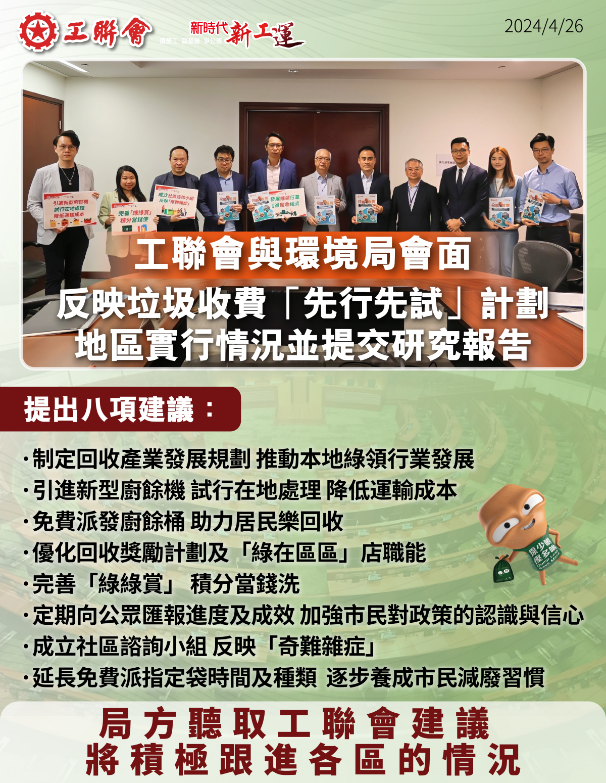【點新聞報道】自垃圾收費「先行先試」計劃(該計劃)於4月1日實施以來,工聯會持續跟進居民及工友對該計劃的意見,積極向政府反映情況並提出建議。今日(26日),工聯會立法會議員郭偉强和陸頌雄,與東區區議員何毅淦、將軍澳南區議員黃遠康、屯門東區議員馮沛賢、觀塘東南區議員簡銘東、葵涌東區議員周潔莹、南區西北區議員林詠欣,向環境及生態局反映垃圾收費「先行先試」計劃在多區的推行情況及市民意見,並提出建議,又提交「垃圾收費實施前夕居民與工友反映的困難疏理與對策研究」報告。
