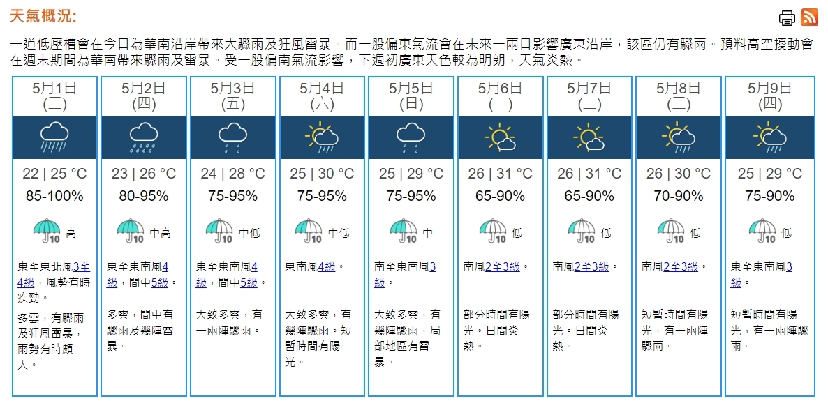 天文台預測,本港地區今日多雲,有驟雨及狂風雷暴,雨勢有時頗大。最高氣溫約25度。吹和緩東至東北風,風勢有時疾勁。展望明日間中有驟雨及雷暴。隨後一兩日仍然有幾陣驟雨。至下周初天色轉為明朗,天氣炎熱。