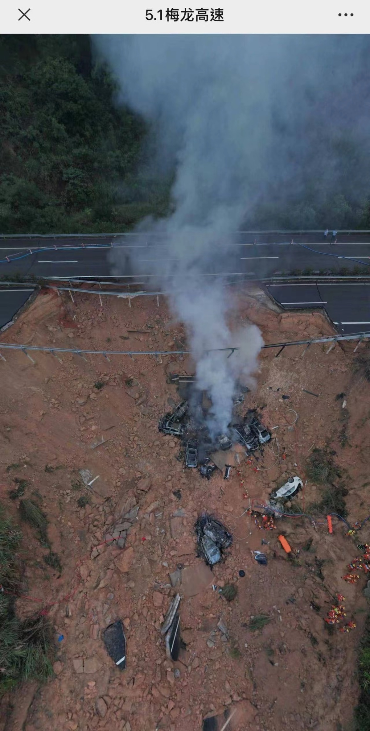 網上流傳的航拍圖片可見,有汽車跌落大坑後疑似起火,冒出火光及濃煙。多架車輛堆疊在一起,遭焚燒後如同廢鐵。