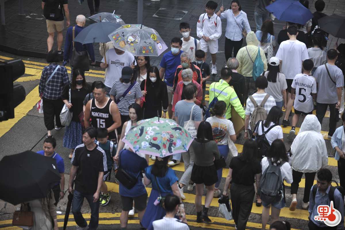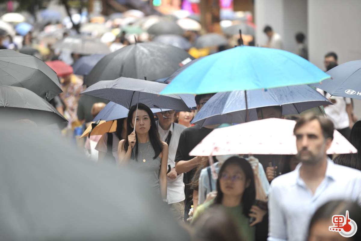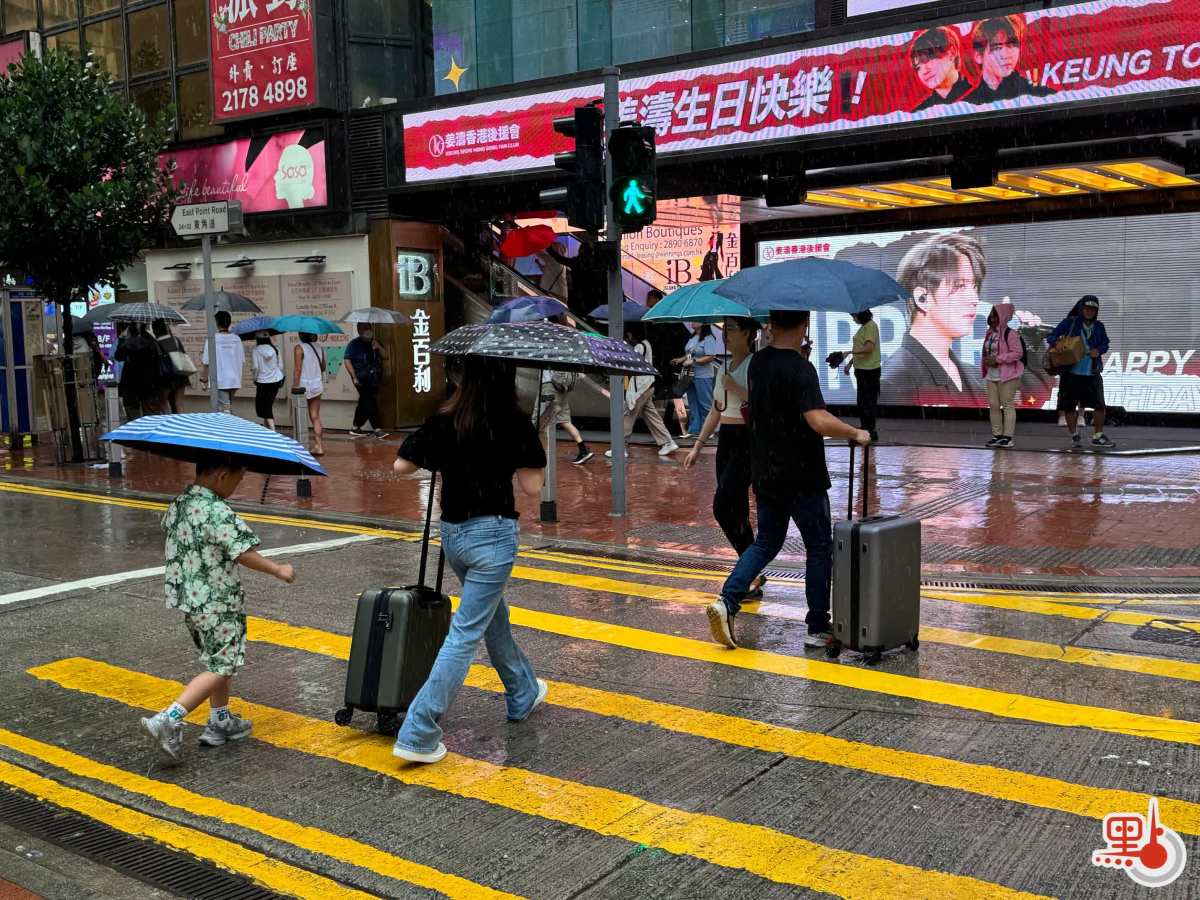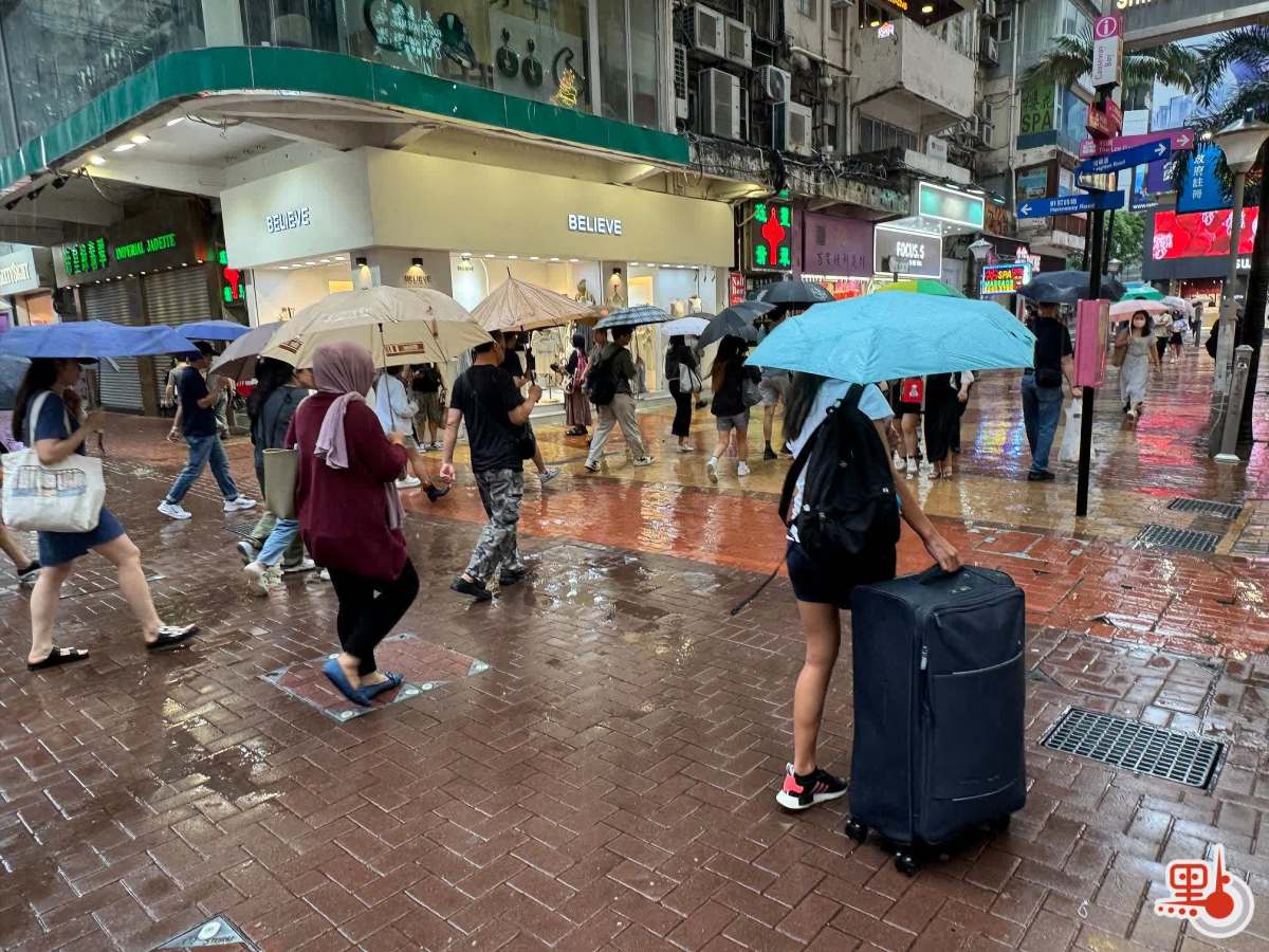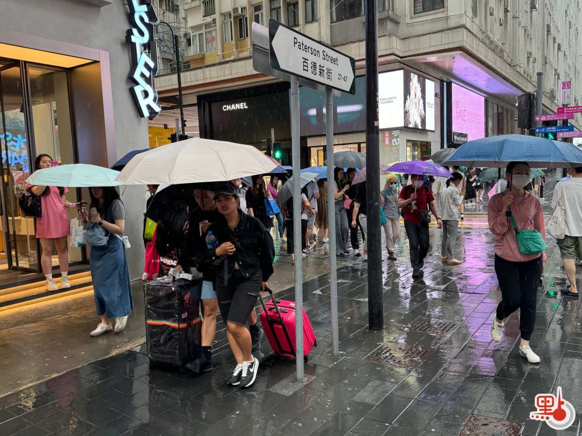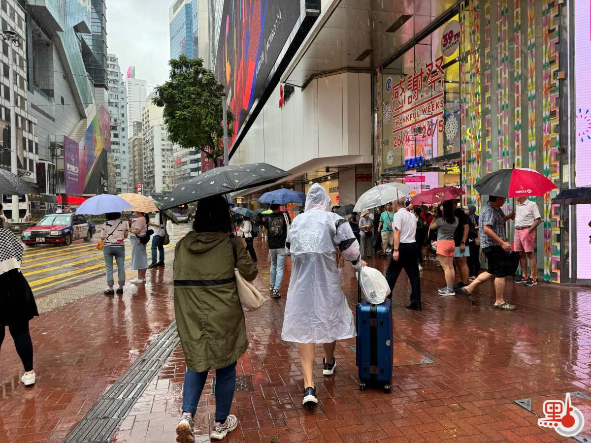 至下午4時左右,雨勢減小,銅鑼灣街頭熙熙攘攘,更加熱鬧。在銅鑼灣崇光百貨,部分名牌店需要排隊入內。位於希慎廣場外的網紅麵包店BAKEHOUSE,依舊不減人氣,仍有多人冒雨光顧。