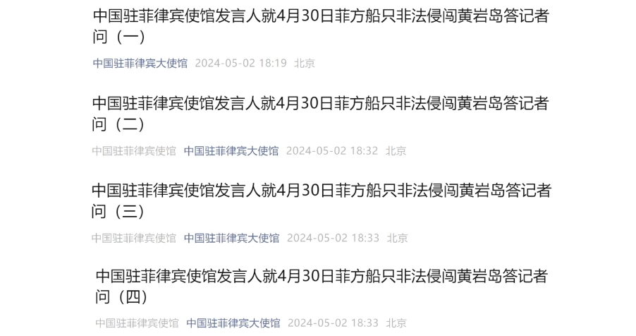 【點新聞報道】據中國駐菲律賓大使館微信公眾號5月2日消息,中國駐菲律賓使館發言人就4月30日菲方船隻非法侵闖黃岩島答記者問。