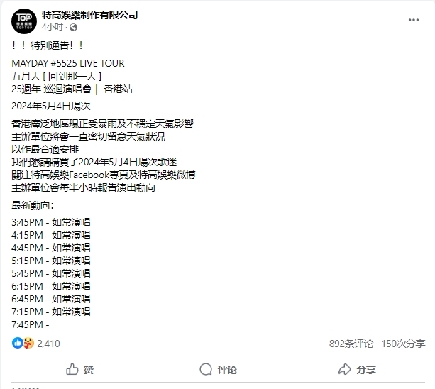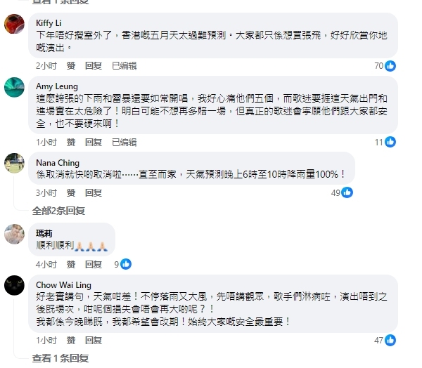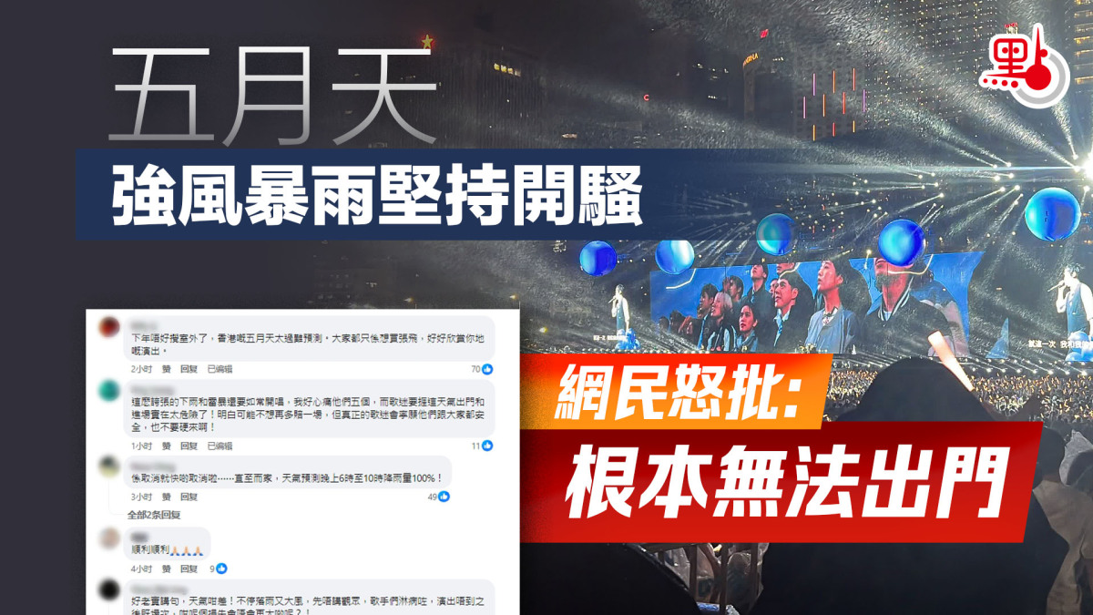 不過,由於強雷雨帶正為本港帶來大驟雨、雷暴及猛烈陣風,有關安排惹來網民不滿,認為應取消今日演唱。有網民在公告帖文下批評主辦方安排,「天文台都預測了等一下會強雷雨,不懂主辦(方)一直猶豫是為什麼?我不懂如果等一下突然要腰斬的時候,大家要好狼狽地離開,是有什麼意義?」又有人指因為強風暴雨,根本無法出門,亦有人批評「主辦方安排真係極差,明知露天場天文台都預計咗嚟緊幾個鐘會落大雨,都唔明拖乜唔取消,想我哋出嚟濕晒再取消?」