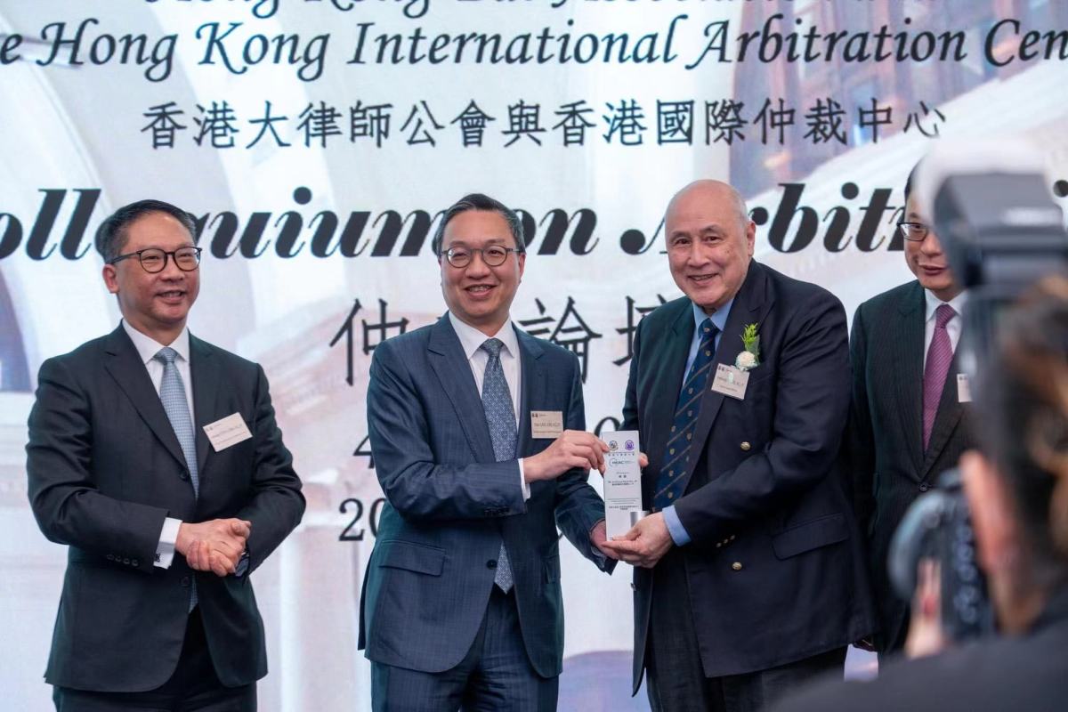 林定國今日出席由香港大律師公會,與香港國際仲裁中心合辦的聯合仲裁論壇。論壇上,司法部公共法律服務管理局局長楊向斌就「中國內地仲裁發展」進行主題演講,隨後梁定邦資深大律師主持「法院與仲裁程序-監督與協助」的對談環節。