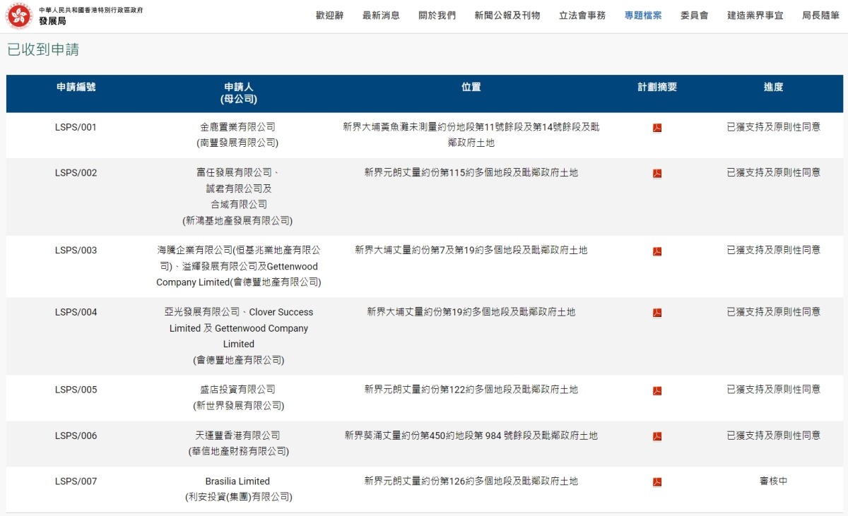 至於較早前接獲的6宗申請已均獲政府原則性同意,發展局指申請人現正進行詳細技術評估,以敲定發展方案和參數,並就擬議發展在交通、環境影響、基建設計等方面完成可行性評估,以進行所需的法定及行政程序,包括城市規劃、工程及土地契約修訂程序。局方預計這些項目的法定改劃程序將由今年第二季開始逐步展開。