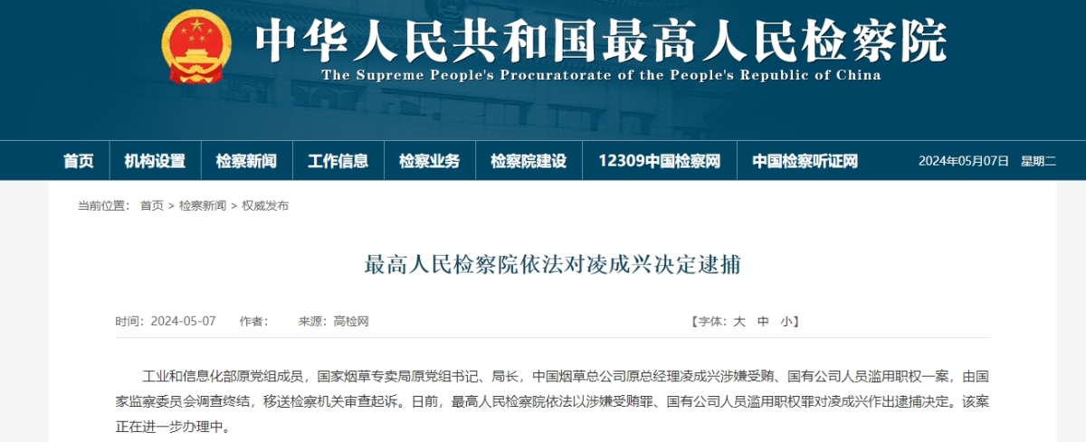 【點新聞報道】最高人民檢察院網站今日(7日)消息,工業和信息化部原黨組成員,國家煙草專賣局原黨組書記、局長,中國煙草總公司原總經理凌成興涉嫌受賄、國有公司人員濫用職權一案,由國家監察委員會調查終結,移送檢察機關審查起訴。日前,最高人民檢察院依法以涉嫌受賄罪、國有公司人員濫用職權罪對凌成興作出逮捕決定。該案正在進一步辦理中。