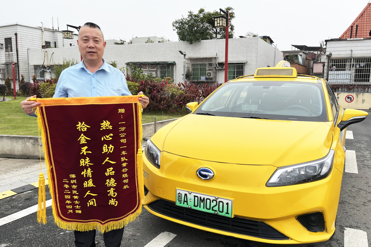 另一面綉有「熱心助人品德高尚,拾金不昧情暖人間」錦旗,則來自深圳的黃女士,贈與如約出行集團白雲公司「的哥」董谷琪,感謝他把自己大意遺留在車廂裏的手機,以快遞方式完璧歸趙。黃女士說:「我是來廣州談業務的,手機裏存着大量的工作文件和客戶信息,遺失的話會對工作帶來巨大影響!幸好遇到熱心的董師傅,不但拾金不昧,更主動幫我把手機寄了回來!廣州真是一座有溫度的城市!」