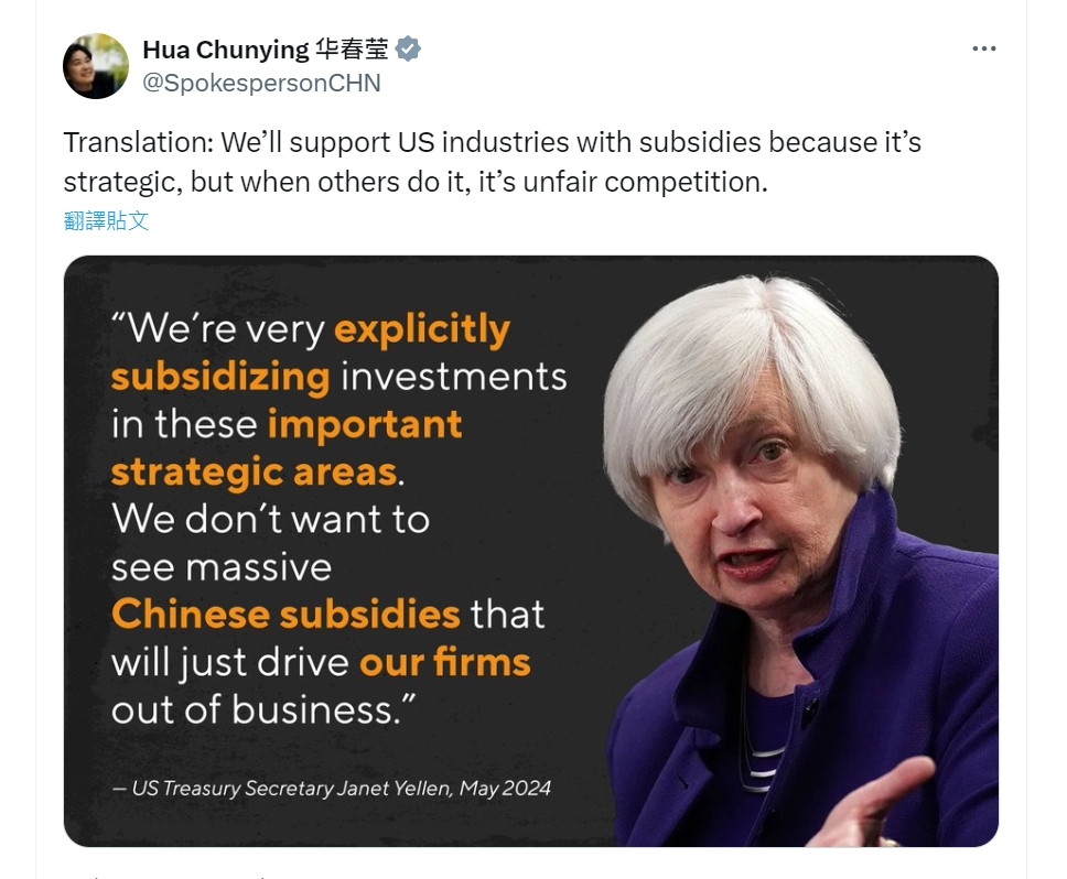 針對耶倫上述言論,華春瑩在社交媒體平台X上發文,「翻譯」耶倫的言論,「翻譯一下:『我們將通過補貼支持美國工業,因為這是戰略性的,但當別人這麼做時,那就是不公平競爭。』」
