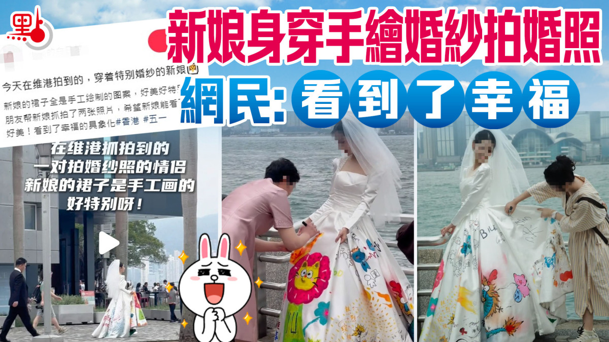 有網民在小紅書以「今天在維港拍到的,穿着特別婚紗的新娘」為題發文,並上載一段影片表示自己在維港「抓拍」時,見到一對正在拍攝婚紗照片的新人,「新娘的裙子是手工畫的,好特別呀!」。她表示,「新娘子的裙子全是手工繪制的圖案,好美好特別」,又大讚新娘好美,「看到了幸福的具象化」。