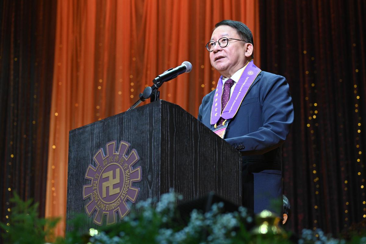 他提到,自1945年成立以來,佛聯會致力促進香港社會和諧團結。佛聯會伴隨香港走過大半個世紀,貫徹「上求佛道、下化眾生」,弘揚佛法,導人向善,並開展多項民生福利事業,涵蓋青年、安老、教育、醫療等領域,惠澤社群。