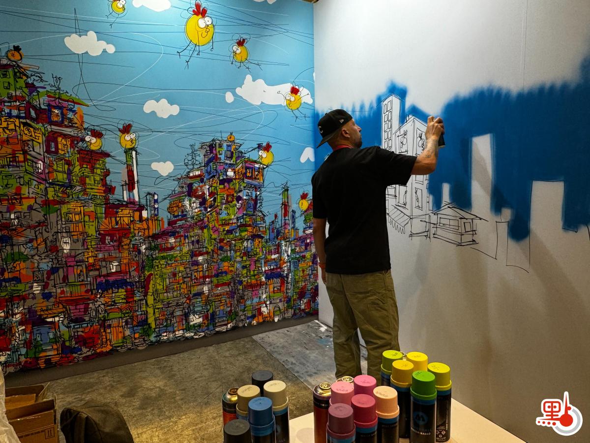 來自法國的藝術家Ceet表示,「剛開始來到香港時,不知道怎麼和中國人進行交流,於是就利用繪畫方式表達心中所想。隨後『小雞』就成為了他繪畫作品當中的一個意象,來代表人類。」今日他在藝術展的畫布上現場塗鴉,描繪遊歷香港時所見到的建築物,並在建築物上描摹小雞,增添生機。