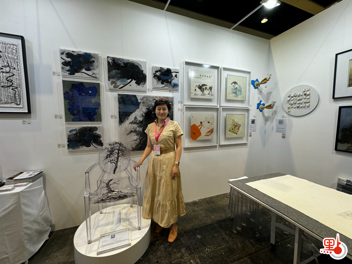 展覽上有一個特別項目叫「舞文弄墨」,展覽了幾位藝術家的水墨作品。其中藝術家劉佳筆下的水墨描繪了風景、動物和人文。她將水墨松樹的元素繪製在了椅子上,取名為「迎客椅」,呼應「迎客松」。還有藝術家將英文字母以鏡面反轉的形式,用水墨勾勒出來,以英文字體詮釋中國傳統書道的肆意灑脫。