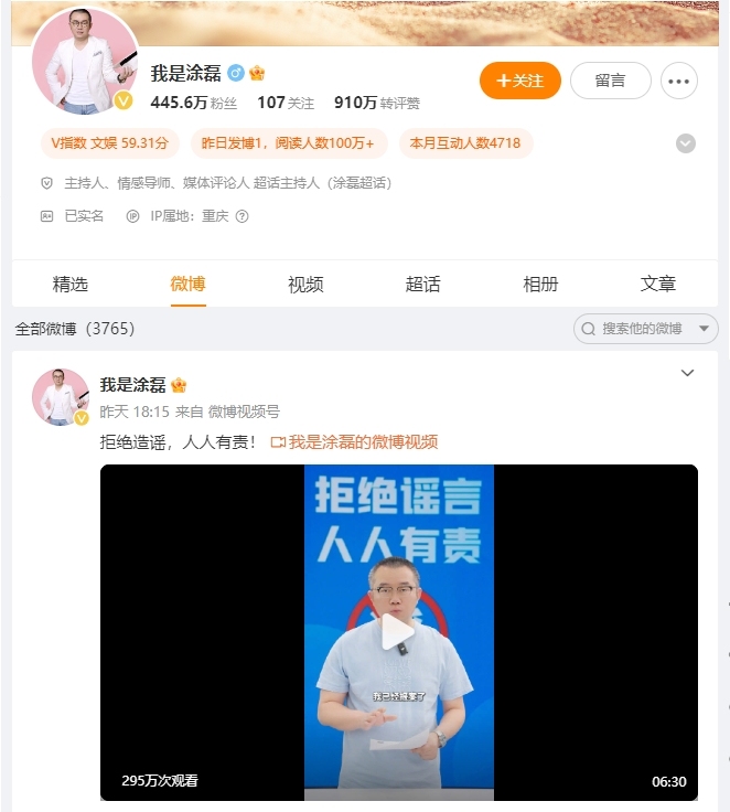 當天下午,知名主持人涂磊發視頻回應此事,並配文:拒絕造謠,人人有責!涂磊在視頻中稱,已經報案,並展示了受案回執。他表示,一定要跟對方對簿公堂,告到底。