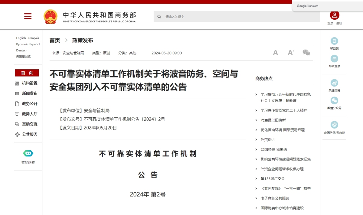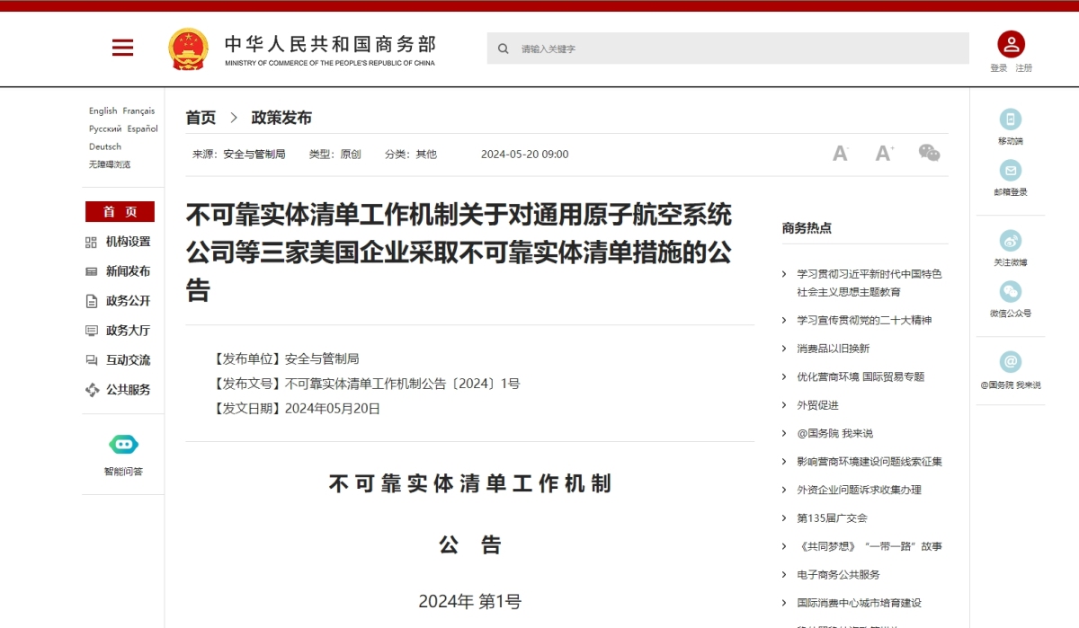 【點新聞報道】商務部網站5月20日發布《不可靠實體清單工作機制關於對通用原子航空系統公司等三家美國企業採取不可靠實體清單措施的公告》《不可靠實體清單工作機制關於將波音防務、空間與安全集團列入不可靠實體清單的公告》。公告決定,將參與對台灣地區軍售的美國通用原子航空系統公司(General Atomics Aeronautical Systems)、美國通用動力陸地系統公司(General Dynamics Land Systems)、美國波音防務、空間與安全集團(Boeing Defense, Space & Security)列入不可靠實體清單。
