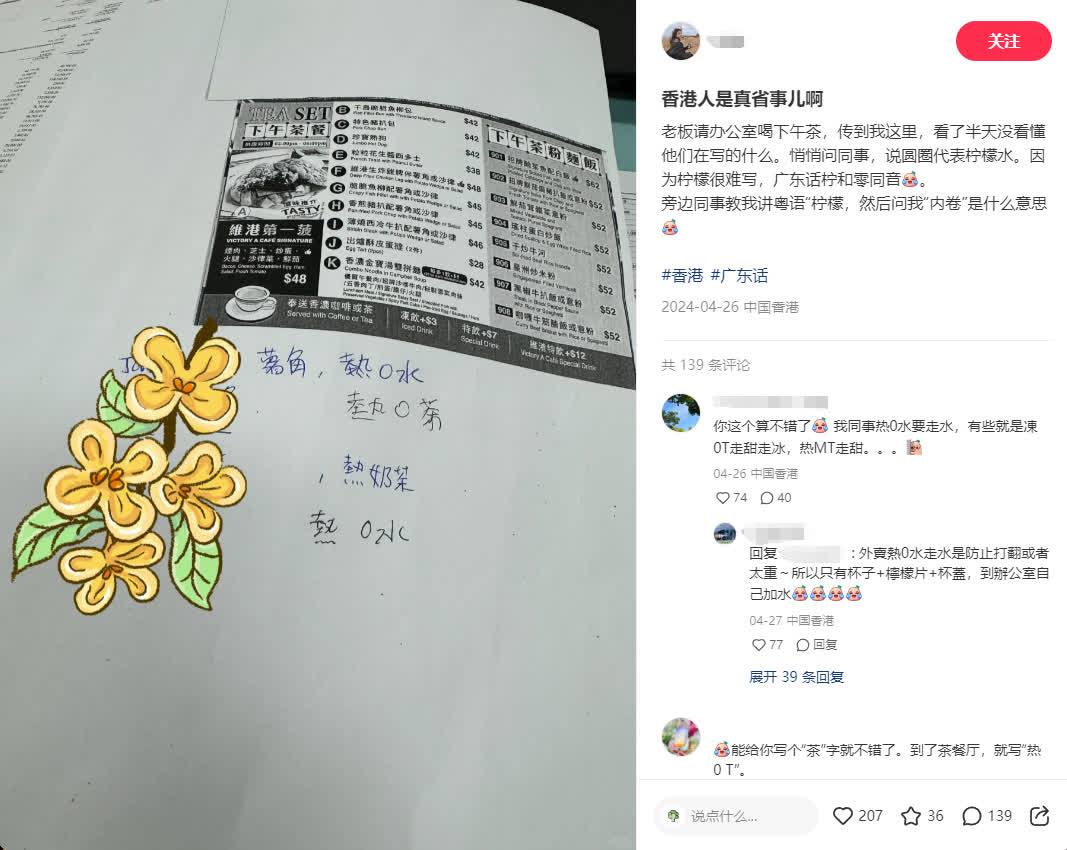 【點新聞報道】最近,有港漂在社交平台發文,稱老闆請客喝下午茶,但是香港同事寫的菜單是「熱0水」、「熱0茶」……看了半天沒看懂。